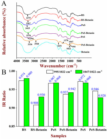 FTIR spectra (A) and 1047 cm−1/1022 cm−1 ratios from deconvoluted FTIR spectra (B) of starches and starch–betanin samples after retrogradation for 7 days. RS: rice starch; PoS: potato starch; PeS: pea starch.