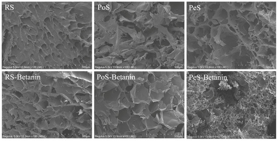 SEM photographs of starches and starch–betanin samples after retrogradation for 7 days. Magnification was 100. RS: rice starch; PoS: potato starch; PeS: pea starch.