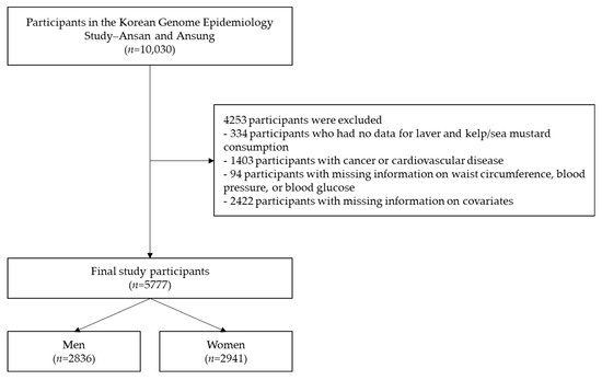 For this study, of the total 10,030 potential participants, the following were excluded: those without laver or kelp/sea mustard intake data (n = 334); those with cancer or cardiovascular disease (n = 1403); those without waist circumference, blood pressure, or blood glucose values (n = 94); and those without information on covariates, including alcohol consumption, smoking status, education level, income level, body mass index (BMI), and physical activity (n = 2422). Of the remaining 5777 participants, 2836 (49.1%) were male (Figure 1). The study protocol was reviewed and approved by the Institutional Review Board (IRB) of Inha University on 31 January 2020 (IRB No. 200129–1A).