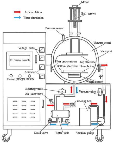 The GJS-3-27-JY RF vacuum dryer was used in this study (Hebei Huashi Jiyuan High Frequency Equipment Co., Ltd., Langfang, China). As shown in Figure 1, the equipment mainly included a control panel and negative pressure tank (diameter 800 mm, length 800 mm), an RF device with upper and lower plates (600 × 400 mm), an elevating device, a water tank, an optical fiber temperature sensor, a weighing sensor, and a pressure sensor. The system had the following characteristics: The RF device was located in the negative pressure tank. The upper and lower plates transmitted a high-frequency current. The elevating device comprised a ball screw and servo motor, which was negatively sealed with a rubber O-ring in the pressure tank after connecting with the plate. After setting the parameters on the control panel, the solid-state relay of the servo motor and vacuum pump was controlled by an RS-485 bus to adjust the plate spacing and the vacuum degree in the negative pressure tank. In addition, the temperature, weight, and pressure of the material in the negative pressure tank were measured and transmitted to the control panel in real-time through four fiber-optic probe sensors installed in the negative pressure tank, with a weight sensor fixed below the lower plate (≤5 kg) and a pressure sensor installed on the inner wall of the negative pressure tank (≥−0.09 MPa). The negative pressure tank condensed the water vapor generated during the drying process, which was periodically collected through the separation valve into the tank to maintain a constant drying chamber humidity.