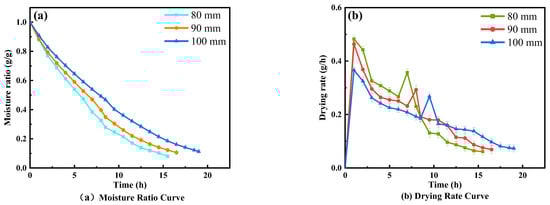 The effect of electrode spacing on the drying characteristics of wolfberries at a 0.025 MPa RF vacuum degree and 55°C hot air temperature is shown in Figure 2. The RF drying time decreased by 17.64% and 29.41% when the plate spacing decreased gradually from 100 mm and when the drying rate decreased from the peak to 0.27 g/h, 0.29 g/h, and 0.36 g/h after 8.5 h, 7 h, and 6 h, respectively. At 5 h, 7 h, and 6 h, the moisture ratio nodes reached 0.46 g/g, 0.47 g/g, and 0.47 g/g, respectively. The diagram indicates that the drying rate of wolfberries decreases with the increase in electrode spacing (Figure 2b), which is consistent with the variation of the RF load current with electrode spacing, where the temperature of the material increases rapidly at the beginning of RF drying, and a higher temperature is reached in a short time with the smaller plate spacing when the initial moisture content is constant. This was because the electric field intensity increased with the decrease in the plate spacing, more energy was absorbed, and the heating rate increased [22,23]. The residual unevaporated free water on the surface of the material was lost with the air during the transfer process from RF to hot air drying, which resulted in a temporary increase in the drying rate. RF heating makes the wolfberries have a positive temperature gradient from the center to the surface, causing a vapor pressure difference and improving the drying rate, and the material enters a low-amplitude stable heating stage after the rapid heating stage [28].
