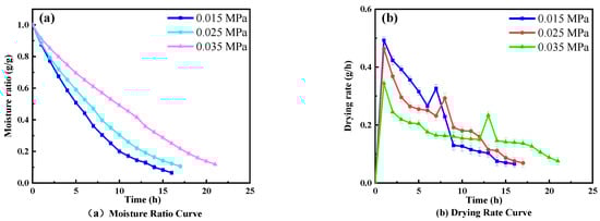 Figure 3 displays the effects of different vacuum pressures on the drying characteristics at an RF plate spacing of 90 mm and a hot air temperature of 55 °C. The moisture ratio node reached 0.42 g/g and the drying rate decreased from the peak to 0.15 g/h after 12 h of RF drying when the vacuum degree was 0.035 Mpa, prior to the transfer to the hot air drying stage. The RF drying time was shortened by 41.6% and 49.5% compared with that at 0.035 MPa when the vacuum degree gradually decreased to 0.025 MPa and 0.015 Mpa, respectively; the corresponding moisture ratio nodes were 0.47 g/g and 0.44 g/g, respectively. The observation showed that the total drying time decreased with the decrease in vacuum pressure, and the drying rate was negatively correlated with the vacuum pressure (Figure 3b). This is because the whole material is heated during RF drying. The surface and internal temperatures increase simultaneously, and the decrease in the vacuum causes the pressure inside the sample to exceed the external pressure and the surface moisture begins to evaporate, causing the drying rate to increase gradually [44,45]. However, the dielectric properties of wolfberry samples decreased with the decrease in moisture content, which reduced the RF energy absorbed by the samples, and the heat needed for the diffusion of bound water molecules was much higher than free water molecules. Therefore, the RF drying rate gradually decreased [18,19,46].