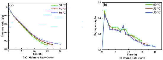 The effects of different hot air temperatures on the drying characteristics of wolfberries at an RF plate spacing of 90 mm and a vacuum degree of 0.025 MPa are shown in Figure 4. The hot air drying time was 14.5 h and the moisture ratio decreased to 0.12 g/g at the end of the drying when the temperature was 60 °C. The hot air drying time was shortened by 23.1% and 42.3%, in turn, and the moisture ratio was reduced to 0.11 g/g and 0.10 g/g when the temperature gradually increased to 55 °C and 60 °C, respectively. Figure 4b shows that the moisture ratio and drying rate decreased gradually during hot air drying, and the decreasing trend of the moisture ratio was more obvious at the higher temperature, with a faster average drying rate and less dehydration time required (p < 0.05). This is due to the heat-transfer resistance between the material and the external environment; thus, the surface temperature is much higher than the internal temperature, resulting in a large temperature difference between internal and external areas during hot air drying [20,47]. However, the temperature gradient inside and on the surface of the wolfberries was gradually reduced with the hot air drying, whereas the flow rate of water in the capillary and intercellular space accelerated, and the heat-transfer rate was improved [18,22].