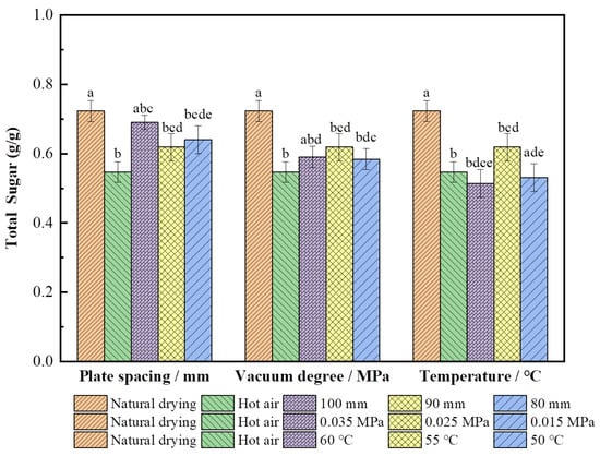 As shown in Figure 5, the polysaccharide content (0.72 g/g) of the wolfberries which were dried by natural drying was the highest, whereas the other drying conditions significantly reduced the polysaccharide content (p < 0.05) because the heating rate of mechanized drying was fast and the Maillard reaction and caramelization of the sample were intensified, resulting in different degrees of sugar spillover. The polysaccharide content of the RF-hot-air-dried wolfberries was the highest (0.69 g/g) when the RF plate spacing was 100 mm, which was 20.3% higher than the content of the single hot air-dried ones (0.55 g/g). This is because the RF drying heats holistically, and the heating rate is slow when the plate spacing increases. Furthermore, the steady-state heating period of the material is longer and the heating uniformity is better [17,18,19], which effectively retains the sugar content. The polysaccharide content (0.62 g/g) at 0.025 MPa was 4.84% and 6.45% higher than at the other two vacuum degrees, respectively, and 12.7% higher than from single hot air drying. It is likely that the vacuum degree of 0.025 MPa can effectively avoid the glow discharge problem of wolfberries during RF drying, reduce the local overheating and burnt phenomenon caused by the uncontrolled effect of sample corner heating [44,45], and retain the sugar content in the sample. The polysaccharide content of wolfberries was 11.3% higher than from single hot air drying when the hot air temperature of combined drying was 55 °C (p < 0.05). This could have occurred because more cellulose in the sample at this temperature was degraded to soluble polysaccharides [35], thereby increasing the polysaccharide content.