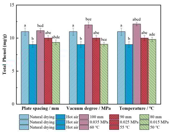 As shown in Figure 6, the total phenol content of dried wolfberries by single hot air drying was 9.04 mg/g, which was 17.7% lower than the content (10.98 mg/g) of natural-dried berries (p < 0.05). This is because hot air drying has a shorter drying time and faster heating rate than natural drying. However, phenolic compounds have strong activity and unstable chemical properties; therefore, the higher temperature accelerates the oxidation and thermal degradation of phenolic compounds [48]. The total phenol content decreased by 10.2% and 15.9%, as compared with 100 mm plate spacing, with the decrease in the plate spacing during the combined segmented drying. This was primarily because the electric field intensity produced by RF increased with the decrease in electrode spacing [11,12], resulting in the destruction of wolfberry cell-wall polymers and the loss of more cell-wall phenolics or adhesive phenolics. The total phenol content was the highest (12.00 mg/g) when the vacuum degree was 0.035 MPa, and the content decreased by 16.6% and 24.35% when the vacuum degree was decreased. Due to the high boiling point of water under low vacuum conditions during the RF drying, the rapid evaporation of water altered the cell-wall structure and affected the activity of intracellular enzymes, which reduced the total phenol content. In the hot air drying stage, the total phenol content of dried wolfberries at 55 °C and 50 °C decreased by 17.5% and 19.3%, respectively, compared with those obtained at 60 °C (12.14 mg/g). This was because a longer drying time was needed at the lower temperature and polyphenol oxidase and peroxidase in the wolfberries increased the oxidation reaction time of phenolic compounds, resulting in a decrease in their content [49].