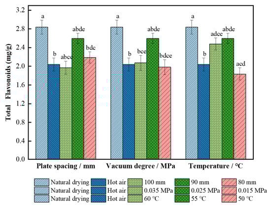 Total flavonoids content of L. barbarum under different drying conditions. Significant differences are represented by different letters (p < 0.05).