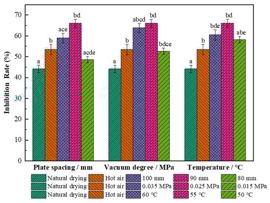 The antioxidant activity of the dried wolfberries is shown in Figure 8 under different drying conditions. The main principle is to determine the scavenging capacity of the stable free radical 1,1-diphenyl-2-trinitrophenylhydrazine by the DPPH method [41]. This antioxidant capacity is expressed by the inhibition rate, and greater inhibition rates correlate with stronger antioxidant activity [41]. The antioxidant activity of dried wolfberries obtained by single hot air and combined drying methods was significantly enhanced (p < 0.05) compared to natural drying (I = 44.16%). The contact time of active antioxidants with air increases due to the long drying time of natural drying, and increased oxidation leads to the degradation of antioxidants [53]. The total antioxidant capacity of wolfberries after combined drying increased first and then decreased. The free radical scavenging rate of active substances was the highest under the conditions of a 90 mm plate spacing, 0.025 MPa vacuum pressure, and 55 °C hot air temperature, and the inhibition rate was 66.14%, which increased by 19.2% and 33.2% compared with natural drying and single hot air drying, respectively. It may be that during the alkali pretreatment under these parameters, RF-hot air combined drying enhanced the hydrogen atom and single electron supply capacity of phenolic compounds in the wolfberries, and the expression of antioxidant activity was more obvious [54].