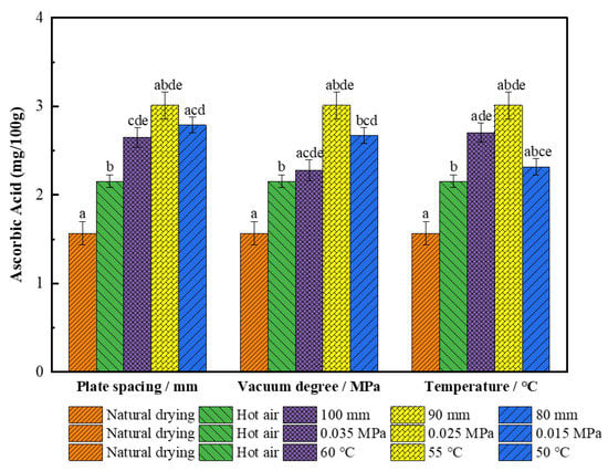Figure 9 shows that the VC of the wolfberries dried by single hot air drying was 2.15 mg/100 g, which was 27.4% higher than from natural drying (p < 0.05) because hot air drying has a faster heating rate and is less time consuming than natural drying; therefore, the retention rate of VC in rapid drying is much higher than that in slow drying. The loss of VC also occurred in the combined segmented drying; however, the degradation of the dried wolfberries is still very low under the conditions of a plate spacing of 90 mm, vacuum pressure of 0.025 Mpa, and hot air temperature of 55 °C. The VC was 3.18 mg/100 g, which was 32.4% higher than from single hot air drying (p < 0.05). This is because ascorbic acid is a sensitive substance, which is easily oxidized and degraded under a high temperature and aerobic environment [22,55]; therefore, the VC of the dried wolfberries is significantly higher after the first stage of RF vacuum drying under a moderate temperature and low oxygen than from hot air drying.