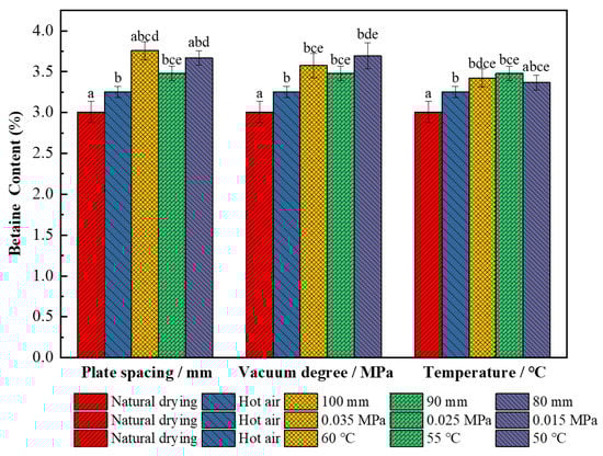 Figure 10 shows that the content of betaine is the lowest (3.01%) after natural drying and the single hot air drying process increases it by 7.38% (p < 0.05); this is because betaine is an internal quaternary ammonium compound, similar to an amino acid amphoteric ion, and has a strong moisture absorption performance. Therefore, its content may be related to drying time and drying temperature, and since natural drying time is longer, it causes the large loss of betaine in wolfberries [56]. When the parameters of combined drying were a plate spacing of 100 mm, vacuum degree of 0.025 MPa, and hot air temperature of 55 °C, the betaine content of dried wolfberry products was up to 3.76%, which was 13.6% and 19.9% higher than in single hot air drying and natural drying processes, respectively. Because betaine is a metabolite, it is often used as an osmotic regulator to stimulate and accumulate under stress conditions, but its accumulation is closely related to the environment and betaine aldehyde dehydrogenase activity [57]. The pretreatment of the alkaline solution and the effect of an RF high-voltage electric field under appropriate parameters may be the dominant factors for the accumulation of betaine aldehyde dehydrogenase, thereby increasing the content of betaine in wolfberries.