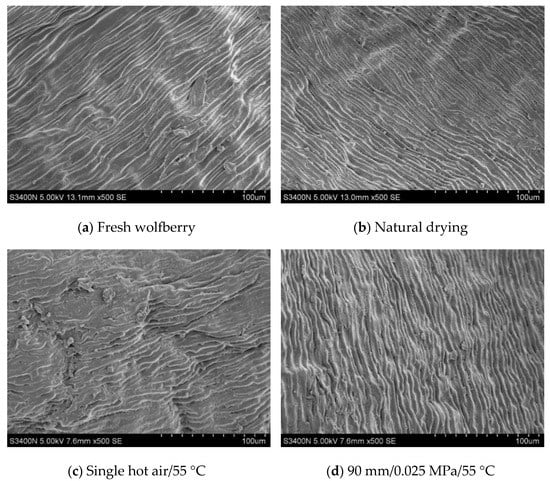 The moisture content was 10 ± 0.5% of the dried fixed-size wolfberry samples (2 × 2 mm), which were tested under different drying conditions, then post-fixed with 2.5% glutaraldehyde for 30 min to stabilize the microstructure prior to electron microscopy. Glutaraldehyde fixation was necessary because dried samples still contained a high moisture content. Gradient dehydration was performed with an ethanol solution series (50%, 70%, 80%, and 90%), followed by dehydration with anhydrous ethanol three times. Each dehydration time was 10 min. Final samples were immersed in 100% tert-butanol for 15 min and then placed in a vacuum freeze drying machine for processing [22,23,24,25,28,29,30]. The sample observation surface was placed upward and fixed on the scanning electron microscopy sample table with conductive tape after treatment, and the surface was coated with an ion sputter-coating instrument for 90 s, then placed under a scanning electron microscope. The acceleration voltage of the electron microscope was set to 5 kV and the magnification was set to 500×. Representative views were selected for microscopic photography.