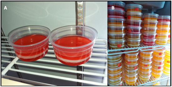 (A) Three-layer probiotic-supplemented gelatin (right) and three-layer placebo-supplemented gelatin (left), the probiotic was included in the middle layer; (B) refrigerated gelatins in storage to be distributed to the participants.