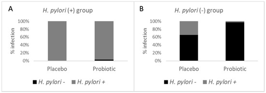 Effect of consuming the probiotic gelatin (100 g serving) containing 107 CFU mL−1 L. fermentum UCO-979C strain (in 100 g serving) for 12 weeks on the percentage of H. pylori-infected participants at the end of the intervention. (A) H. pylori-infected participants before the intervention; (B) H. pylori non-infected participants after the intervention. H. pylori (−): H. pylori non-infected participants; H. pylori (+): H. pylori-infected participants.