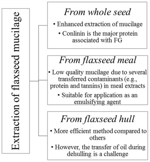 Wet and dry processes can be used for flaxseed dehulling. Wet methods have been widely used for demucilaging of flaxseed [3,10,13]. FM is primarily obtained by aqueous extraction of the whole seed or meal or hulls [14] (Figure 1).