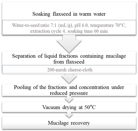 The extraction of FM is feasible commercially only as a byproduct of the flaxseed oil industry [12]. Extraction conditions (e.g., extraction temperature, pH) have a significant impact on the rheological properties, chemical composition, and yield of flaxseed gum [5,8].
