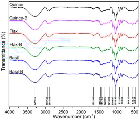 Davachi et al. [78] fabricated edible films based on flaxseed and other (quince and basil) seed mucilages with lactic acid probiotic strain L. rhamnosus GG (LGG). All of the mucilage films exhibited a high moisture retention capacity irrespective of the presence of probiotics, which is desirable for preserving the moisture/freshness of food. Compared with basil mucilage films, flaxseed mucilage films exhibited relatively high thermal stability and mechanical robustness with higher elastic moduli and elongation at break. These films effectively maintained the viability of the probiotics and protected fruits against UV light during storage. All the films, which were obtained from different seed mucilages, exhibited a similar polysaccharide structure, and the presence of bacteria (over a month) did not affect the structure of the samples, as shown in Figure 4.
