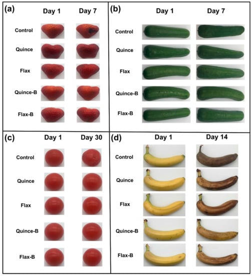(a) Strawberries, (b) cucumbers, (c) cherry tomatoes, and (d) banana coated with quince and flax with and without probiotic LGG as compared with the uncoated samples (Figure reproduced from Davachi et al. [78]).