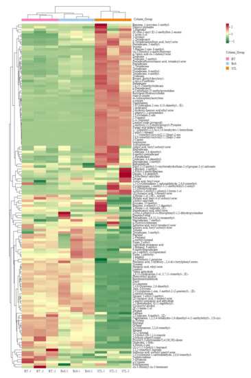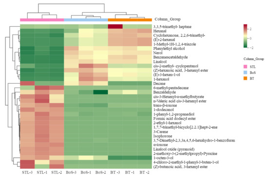 To further analyze the differential VMs among the BT, STL, and BoS samples, we constructed a thermography chart (Figure 4) based on 33 specific differential VMs (Table S3). The BT and BoS samples with a sweet and glutinous rice aroma were clustered into one category, whereas the STL samples formed their own category exhibiting a strong glutinous rice aroma (Figure 4). In addition, the 33 VMs were grouped into three major classes. The first class included eight VMs, namely, (E)-2-hexenal, 1-methyl-1H-1,2,4-triazole, benzeneacetaldehyde, linalool, phenylethyl alcohol, and nerol, which had the highest contents in BT and distinctly contributed to the sweet aroma of the BT [5,23]. The second class included (E)-3-hexen-1-ol, cis-2-methyl-cyclopentanol, 1-hexanol, decane, and (Z)-hexanoic acid, 3-hexenyl ester, which were more abundant in the BoS samples than in either the BT or the STL samples; therefore, they were determined to be responsible for the sweet and glutinous rice aroma of BoS, following the combination of BT and STL. The third class included 20 VMs that were more abundant in the STL samples than in the other two samples; this category included compounds such as benzaldehyde, 1-octen-3-ol, 3-carene, 2-ethyl-1-hexanol, isophorone, linalool oxide (pyranoid), 2-methoxy-3-(2-methylpropyl)-pyrazine, 1-dodecanol, n-valeric acid cis-3-hexenyl ester, formic acid dodecyl ester, α-ionone, and trans-β-ionone, which contributed greatly to the strong glutinous rice aroma of the STL samples [7,12]. When combined with the Venn diagram, these findings clearly showed that the concentrations and proportions of the volatile substances have strong effects on the odor of each type of tea blend.