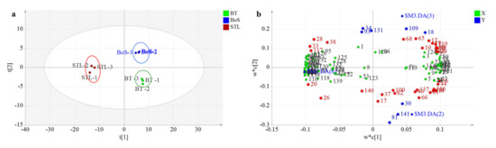PLS-DA is widely used in food and agriculture research as a discriminant analytical method [18,21,22,23]. Therefore, we applied PLS-DA to explore the influence of STL addition on VMs and aroma improvements of BT and to clarify the differences in volatile compound contents in the BT, BoS, and STL samples according to the 141 compounds found in dry tea. The three sample types were effectively distinguished by PLS-DA (Figure 2a). The STL samples clustered together in both quadrants on the left side, whereas the BoS and BT samples clustered in the upper-right and lower-right quadrants, respectively. These results were consistent with the sensory quality evaluation (Table 2) and the grouping pattern obtained using the heatmap cluster analysis (Figure 1). The model was verified by cross-validation after selecting three principal components. The related variables were as follows: R2X (cum) was 0.955, R2Y (cum) was 0.988, and Q2 (cum) was 0.949, which indicated that this model was reliable and had strong prediction abilities.