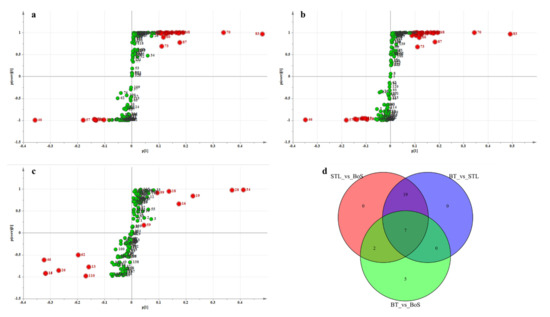 Differential volatile metabolites (VMs) in BT vs. STL, STL vs. BoS, and BT vs. BoS. S-plot generated from the PLS-DA model for BT vs. STL (a), STL vs. BoS (b), and BT vs. BoS (c). Green and red spots indicate all VMs involved in the model, and red spots show the most significant changes and higher contributions to the classification pattern. (d) Venn diagram of the differential VMs in BT vs. STL, BoS vs. STL, and BT vs. BoS. STL, Strobilanthes tonkinensis Lindau; BT, black tea; BoS, black tea with added STL.