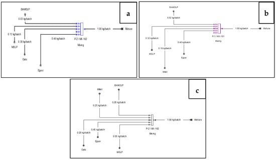 Process flow diagram of Bambara groundnut-Moringa oleifera snack bar enriched with Bambara groundnut-Moringa oleifera leaf protein (BAMOLP) at low, medium, and high concentrations, (a) oats plus 3% BAMOLP, (b) millet plus 2% BAMOLP, (c) oats, millet, and 5% BAMOLP.