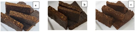 Physical appearance of BAMOnut snack bars—(a): BAMOnut enriched with oats and 3% BAMOLP (BAMOnut-OB3), (b): BAMOnut enriched with millet and 2% BAMOLP (BAMOnut-MB2), and (c): BAMOnut enriched with oats, millet, and 5% BAMOLP (BAMOnut-OMB5).