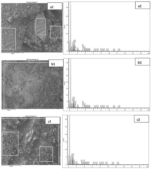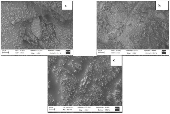 EDX characterization spectrum obtained for BAMOnut snack bars: (a) BAMOnut enriched with oats and 3% BAMOLP, (b) BAMOnut enriched with millet and 2% BAMOLP, (c) BAMOnut enriched with oats, millet and 5% BAMOLP. All the micrographs are on a scale of 100 µm. Visible peaks confirm the presence of sodium, magnesium, phosphorous, potassium, calcium, iron, nickel, copper, zinc, selenium, iodine.