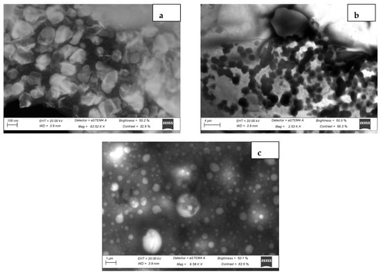Scanning Transmission Electron Micrograph of Bambara groundnut-Moringa oleifera bars (BAMOnut). (a) Morphology of BAMOnut enriched with oats and 3% BAMOLP on 100 nm scale, (b) BAMOnut enriched with millet and 2% BAMOLP on 4 µm scale, (c) BAMOnut enriched with oats, millet and 5% BAMOLP on 1 µm scale (magnification 63.52 KX for (a), (b) 2.53 KX, (c) 6.58 KX).