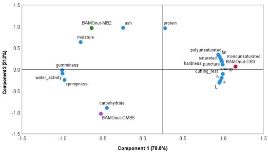 Principal component analysis (PCA) on the physical and proximate properties of Bambara groundnut-Moringa oleifera snack bar data is presented in Figure 7. The first and second principal components represented 78.8% and 21.2% of the observed variation, respectively. PC1 separated the BAMOnut-bars, with the BAMOnut-MB2 and BAMOnut-OMB5 on the top right and bottom right respectively, and the BAMOnut-OB3 nearer the middle on the right. BAMOnut-OB3 was characterised by higher fat (mono and poly fat), cutting, energy, and lightness, BAMOnut-MB2 by ash content and moisture, and BAMOnut-OMB5 by carbohydrate. Yellowness and protein content can be attributed to both OB3 and MB2. The difference in fat content of BAMOnut-OB3 compared to BAMOnut-MB2 and BAMOnut-OMB5 may be due to the high content of fat in oats (8%) compared to 4.8% of fat in millet. High-fat content leads to high energy. The lightness of BAMOnut-OB3 could be a result of a decreased concentration of MOLP in the formulation compared to BAMOnut-MB2, and variation of ingredients compared to OMB5. The ash content, which is an indication of mineral presence, was higher in BAMOnut-MB2 due to the higher concentration of MOLP in that formulation compared to BAMOnut-OB3 and BAMOnut-OMB5, and its moisture content was higher due to the cooked millet in the formulation. BAMOnut-OB3 and BAMOnut-MB2 can be considered better formulations than BAMOnut-OMB5. The moisture, energy, and fat content of BAMOnut-OB3 were closer to the required standards for RUTF compared to those of BAMOnut-MB2, while the colour of BAMOnut-OB3 was better, which is an important attribute for consumer acceptability of a food product. Although BAMOnut-MB2 was high in ash content, its moisture content was high, and it will be safer to choose a formulation with lower moisture content to guarantee good shelf life and a high-quality product. BAMOnut-OB3 could therefore be considered as the best formulation for the BAMOnut-snack bar, which was also confirmed by the water activity described in Section 3.1.4 and amino acid content in Section 3.2.1.