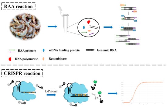 In previous studies, researchers have focused on optimizing the composition of the system (e.g., Cas nuclease, reporter, and Mg2+), adjusting the stoichiometry between the Cas protein and crRNA, or modifying the crRNA to improve detection [23,24]. In addition, several researchers have reported that the reaction efficiency can be further enhanced through chemical addition. For example, the chemically enhanced CRISPR detection method called CECRID was applied for detection [25]. However, its effectiveness in the detection of V. parahaemolyticus in raw shrimp samples has rarely been investigated; therefore, the factors affecting its sensitivity are unclear. Moreover, the method requires the transfer of amplification products, which can cause aerosol contamination.
