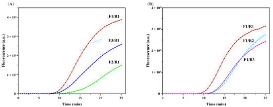 The RAA efficiency is strongly influenced by the primer sequence. Therefore, we examined different primer combinations using the V. parahaemolyticus tlh gene as the target gene. Three upstream primers and three downstream primers were designed for screening, while a fluorescent probe was designed to bind to the primers for detection via qRAA. The downstream primer R1 was used in combination with the upstream primers in sequence. The best amplification efficiency was achieved when R1 was combined with upstream primer F1. When 1 × 106 CFU/mL DNA was used as the template, the fluorescence signal started to appear after ~8 min. Among all primer combinations, the F1–R1 combination featured the earliest peak time and the highest endpoint fluorescence value. The other primer combinations showed slightly later peak and lower endpoint fluorescence than F1–R1 (Figure 2A). F1 was selected for screening with all reverse primers, and only R1 yielded the best results (Figure 2B). Therefore, the F1–R1 combination was considered the optimal primer pair.