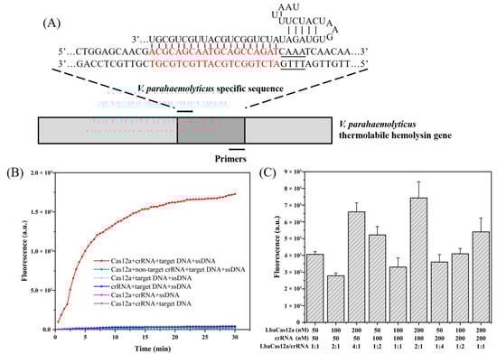 Feasibility analysis of RAA–CRISPR for nucleic acid detection. (A) Sequences of crRNA designs used for V. parahaemolyticus detection. (B) Feasibility of RAA–CRISPR for V. parahaemolyticus detection in fluorescence reporting. (C) Optimization of the Cas12a/crRNA concentration.