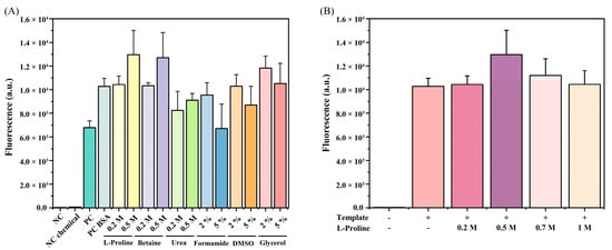 Effects of chemical additives on the CRISPR detection phase. (A) Evaluation of the effects of different chemical additives on CRISPR detection systems. NC denotes negative control; NC chemical denotes that no target template was added, but chemical additives were added; PC denotes positive control; PC BSA denotes the addition of target template and BSA. (B) The effect of L-proline addition on CRISPR-based detection system.