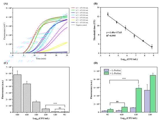 LOD results of different methods, for ten-fold serial dilutions of V. parahaemolyticus in pure culture: qRAA (A), RAA–CRISPR (C), and CE–RAA–CRISPR (D). (B) Linear relationship between fluorescence intensity and the concentration of V. parahaemolyticus over the range of 6.7 × 103 to 6.7 × 108 CFU/mL. *** indicated a statistically significant difference, p < 0.001; ns indicates no significant difference.