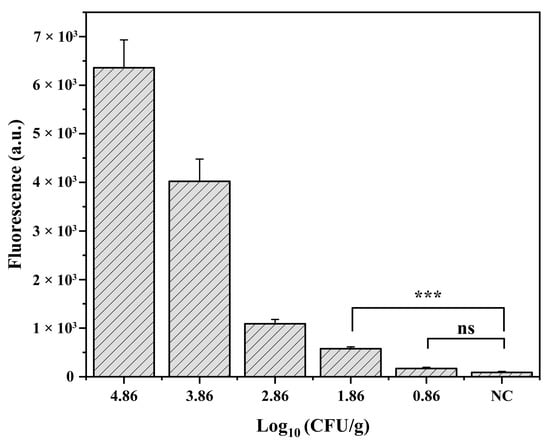 LOD of the CE–RAA–CRISPR for the detection of V. parahaemolyticus in shrimp. *** indicated a statistically significant difference, p < 0.001; ns indicates no significant difference.