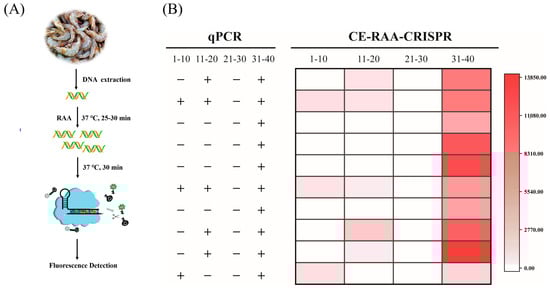 Evaluation of CE–RAA–CRISPR for the detection of V. parahaemolyticus in actual food samples. (A) Schematic illustration for the detection of V. parahaemolyticus in actual food samples using CE–RAA–CRISPR. (B) Detection of V. parahaemolyticus in 40 aquatic samples using the qPCR method (left) and CE–RAA–CRISPR assay (right).