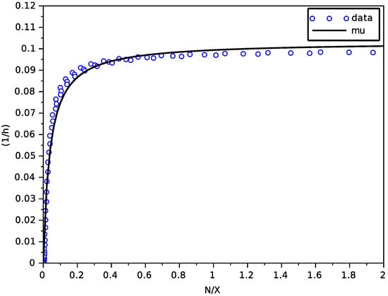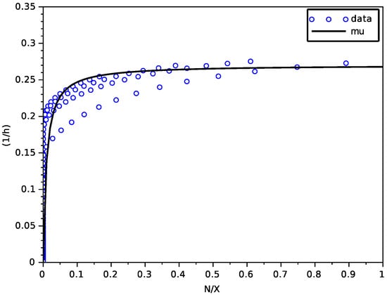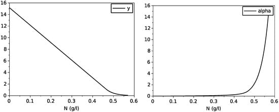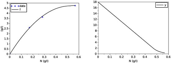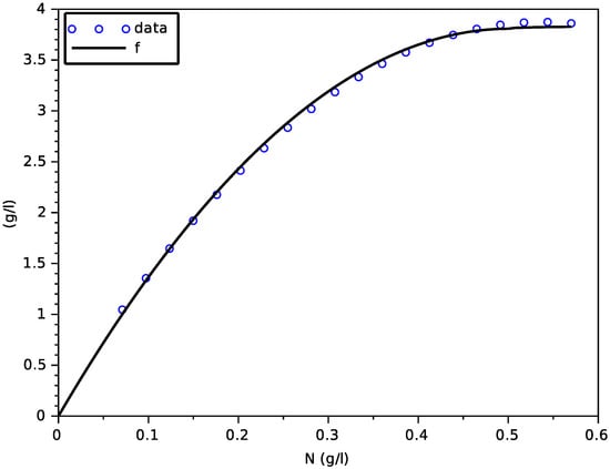 Figure 7 shows that the data do not precisely follow the graph of a function (this is most probably due to the fact that the model is not Markovian). Indeed, this happens mainly for the large value of the initial nitrogen. We believe that this could be explained by the dynamics of the biomass X of this model, which is a logistic law with a carrying capacity given by an heuristic expression that depends on , and not dynamics coupled with the dynamics of N (indeed the interval of tested values of might be larger than the validity of this model). However, we have fitted the graph of a Contois function to these data with the parameters given in Table 5, which was able to satisfactorily reproduce the trajectories of the model for a large amplitude of values of , as we shall see later on.