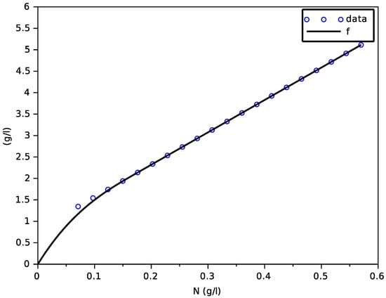and m a maintenance function, which is positive for and . We choose here a ratio-dependent kinetics function to reproduce the observation that the growth is slowing down under an excess of yeast, with a Contois expression as in [3]. In the literature, the maintenance m is often considered as constant [12,13], which was validated in continuous culture (chemostat). In general, continuous cultures are intended to be operated at a stationary phase, very differently to batch-operating mode. However, as already investigated in [17], maintenance terms have to depend on the level of available resources; say, R (N here). In particular, constant maintenance in a batch model would imply when the resource is exhausted, i.e., , and thus R could take unrealistic negative values, as underlined in [14]. In [15,16], the maintenance is directly related to the microbial activity, which is stopped in absence of nutrients. This is why we consider a maintenance function proportional to the growth activity, with a factor that might depend on the nitrogen concentration (one may expect that it decreases when the substrate N becomes rare)