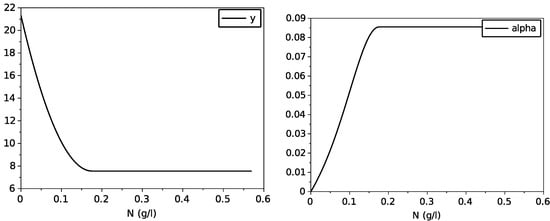 Note that the model with transporters was validated only for in the interval [0.071, 0.57] g·L, and that we have no a priori information about the behavior of the yield for values of smaller than 0.071 g·L. The threshold parameter was simply chosen so that the simulations of the variables X and N of the model (3) and (4) were the closest to the ones of the transporter model.