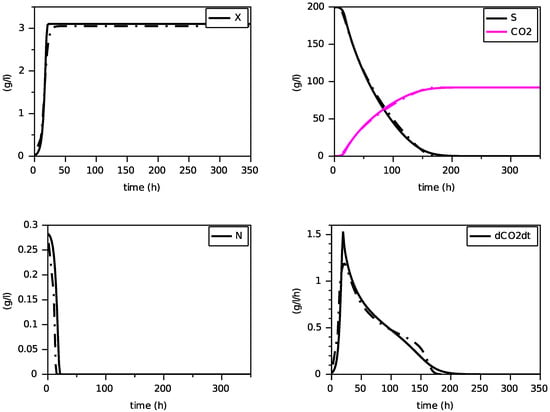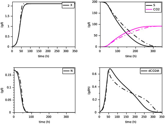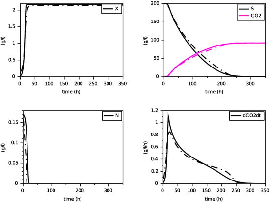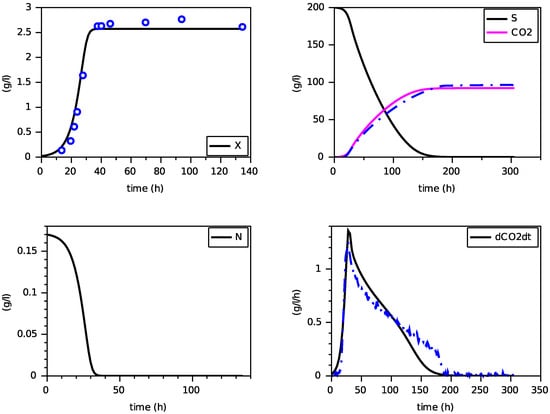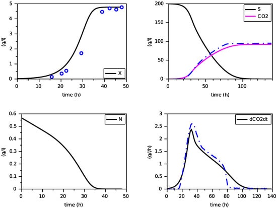 Finally, we present on Figure 4, Figure 5 and Figure 6 simulations of the new model for three largely different initial values of nitrogen from 0.170 g·L to 0.567 g·L. The evolution of the ethanol concentration E has not been reproduced as it is proportional to the CO concentration.