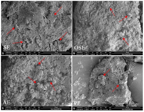 The SEM images of the FMS protein are displayed in Figure 1. During the freeze-drying process, protein-protein interactions including hydrophobic, electrostatic and covalent linkages enhanced and resulted in solute aggregation. Therefore, the surface of all proteins was a continuous space structure and presented a sheet-like structure. Moreover, some roughened clusters (red arrows) can be observed on the protein’s surface. There was no visible difference among SE, OSE and AE samples. However, PE sample showed an irregular shape and rough surface, which indicated that thermomechanical treatment significantly destroyed the protein structure. Liu et al. [15] reported that the peanut protein after different oil extraction processing showed consistent surface morphology, while drying methods affect significantly the surface morphology.