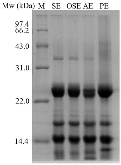 The SDS-PAGE profile of FMS protein is shown in Figure 2. The electrophoretic profiles of SE and OSE showed large similarities, which contained major bands with 36, 23–26, 18–20, and 7 kDa. Compared with SE and OSE, AE had very low concentration of low Mw subunits (36, 20, and 19 kDa), but a new band appeared at the bottom. The three prominent bands with 36, 20, and 7 kDa of PE disappeared compared with other protein samples, whereas bands with 9 kDa appeared. This phenomenon may be due to high-temperature pressing process altering the aggregation state of the protein. The electrophoresis profile suggested that FMS protein mainly contains low Mw polypeptide subunits.