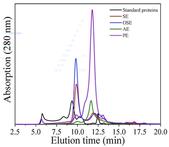 However, the process of oil extraction significantly impacted the contents of FMS protein. SE and OSE contain high levels of protein aggregates (8.01 and 7.29 mg/mL) and small amounts of protein non-aggregates (0.61 and 0.43 mg/mL), whereas AE and PE showed opposite results. It indicated that the organic reagent (petroleum ether and n-hexane) could cause the peak of protein non-aggregates to shift to higher Mw.