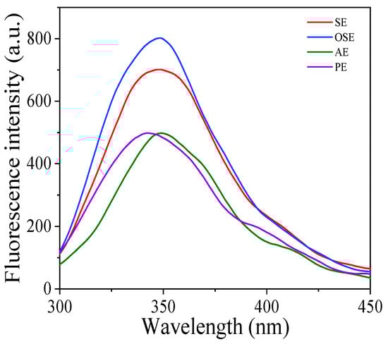 From Figure 4, the λmax of SE, OSE and AE was closed to 349 nm, whereas the λmax of PE had a blue shift to 344 nm, showing that the aromatic amino acids in PE were transferred into a hydrophobic environment [32,33]. It was in line with the result of amino acids, the tyrosine and phenylalanine contents in PE were lowest (Table 2). This phenomenon revealed that the oil extraction method could alter the tertiary structures and aggregation state of FMS protein. From Figure 4, the fluorescence intensity of SE and OSE was greater than that of AE and PE, suggesting organic solvent extraction (petroleum ether and n-hexane) contributed to the exposure of aromatic amino acids and created a more compact structure of the protein. On the other hand, the low fluorescence intensity of PE may be due to the unfolding of protein during the pressing process [31]. The previous study of Liu et al. [15] reported that the fluorescence intensity of peanut protein obtained by solvent extraction was higher than that of aqueous extraction.