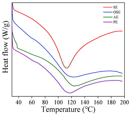 The ΔH of SE, OSE, AE, and PE varied from 82.94 to 184.85 J/g, and AE had the lowest ΔH, suggesting that it needs less energy for denaturation. In addition, the phenomenon indicated that the freeze treatment (−20 °C) during the aqueous extraction process disrupted the intermolecular bonds, resulting in the AE sample’s compact structure being lost and increased protein unfolding.