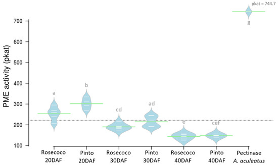 Bean plot showing the activity of the PME enzyme in developing seeds of fast-cooking (Rosecoco) and slow-cooking (Pinto) P. vulgaris varieties. Green lines indicate the sample means, white lines represent individual data points, and polygons represent the estimated density of the data. The dashed horizontal line shows the overall mean. Means with similar letters were not significantly different at p < 0.05.