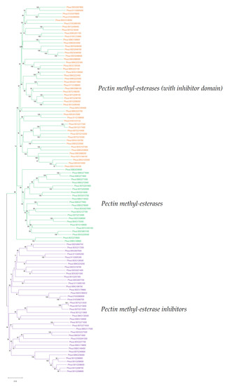 Phylogenetic tree showing the evolutionary relationship of a total of 113 genes encoding pectin methyl-esterases and pectin methyl-esterase inhibitors in P. vulgaris. The tree was inferred using the neighbor-joining method, and the evolutionary distances were computed using the p-distance method in MEGA software [34].