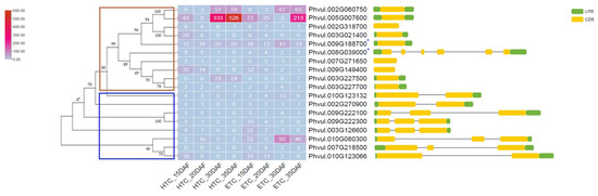 A hierarchical clustered heat map showing the RPKM expression and the gene structure of highly expressed genes encoding the pectin methyl-esterases (PMEs) and pectin methyl-esterase inhibitors (PMEIs) from fast-cooking (Rosecoco, ETC) and slow-cooking (Pinto, HTC) P. vulgaris varieties. Brown and indigo boxes indicate the PMEI and PME clusters, respectively. PME-encoding genes that clustered together with PMEIs are denoted by indigo asterisks. UTR: untranslated region; CDS: coding sequence.