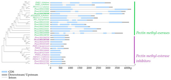 Phylogenetic tree showing the evolutionary relationship of highly expressed genes encoding pectin methyl-esterases (PMEs) and pectin methyl-esterase inhibitors (PMEIs) in P. vulgaris in comparison with those from other plant species (A. thaliana, C. sinensis, S. lycopersicum, and A. deliciosa).