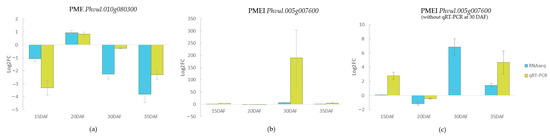 Two PME-related genes selected for confirmation of the RNA sequencing results showed similar gene-expression results using qRT-PCR (Figure 5). The genes, which included the highest expressed PME (Phvul.010g080300) and PMEI (Phvul.005g07600), showed similar patterns of upregulation or downregulation in the slow-cooking bean in a comparison between the RNA sequencing and qRT-PCR experiments, as illustrated in Figure 5a,b. The log2 fold-change (Log2FC) pattern for both experiments was similar for the PME gene Phvul.010g080300, in which we observed an upregulation of the PME gene at 20 DAF in the slow-cooking bean for both RNA sequencing and qRT-PCR, and a further downregulation at 15, 30, and 35 DAF. For the PMEI Phvul.005g007600, we observed a very high Log2FC of 189.53 at 30 DAF in the qRT-PCR experiment. An upregulation of 6.85 was also observed in the RNA sequencing experiment at the same seed-development stage. Overall for this gene, an upregulation of expression in the slow-cooking bean was observed at all sampled seed-development stages except for 20 DAF, for which a downregulation of −1.15 and −0.44 was observed in the RNA sequencing and qRT-PCR experiments, respectively (Figure 5b,c).