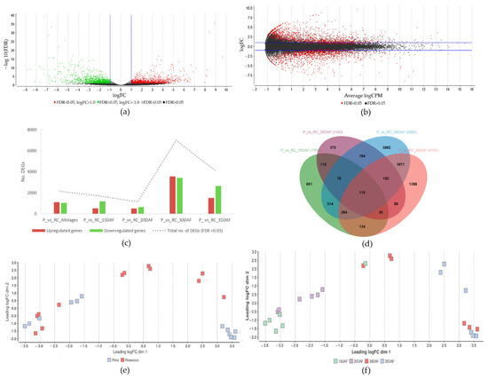Results of the differential gene-expression analysis showing the distribution of samples and DEGs. (a) Volcano plot showing the log2 fold change in expression between slow-cooking beans (Pinto) and fast-cooking (Rosecoco) on the x-axis against the negative Log10 of FDR of the DEGs (y-axis). Significantly upregulated and downregulated genes are indicated with red and green data points, respectively. Black data points depict nonsignificant DEGs. (b) MA plot showing the log2 fold change in expression in fast- and slow-cooking beans (y-axis) against mean expression level (x-axis). Red data points depict DEGs that were significant at FDR < 0.05. Black data points had FDR values of >0.05. Blue lines depict the specified thresholds for the log2 fold change in (a,b). (c) Bar chart showing the number of DEGs in the samples, and (d) Venn diagram showing the number of shared DEGs between the samples. (e) Multidimensional scaling (MDS) plot showing the pairwise distribution of samples within the different phenotypes of slow-cooking and fast-cooking beans, and (f) within the different seed-development stages. Distances on the plot represent log2 fold changes between the samples.